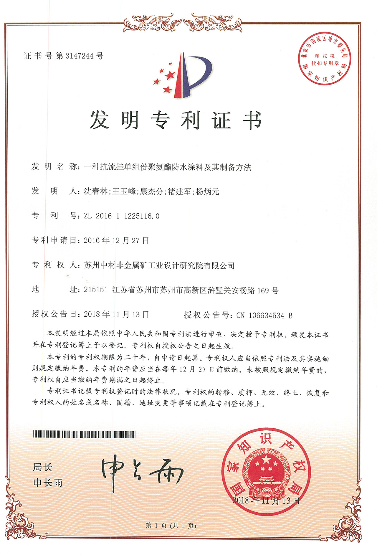 一種抗流掛單組份聚氨酯防水涂料及其制備方法-專利證書