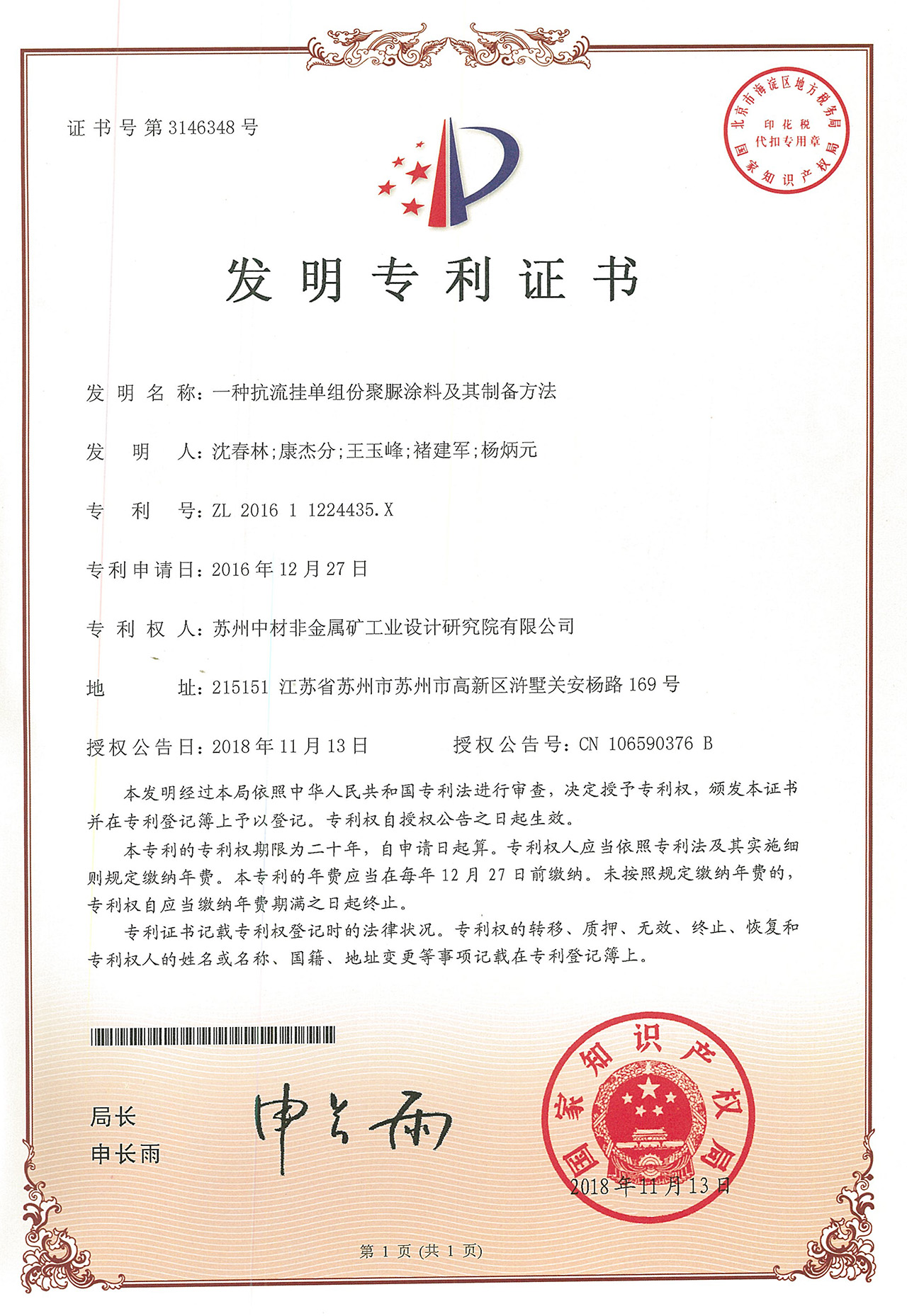 一種抗流掛單組份聚脲涂料及其制備方法-專利證書