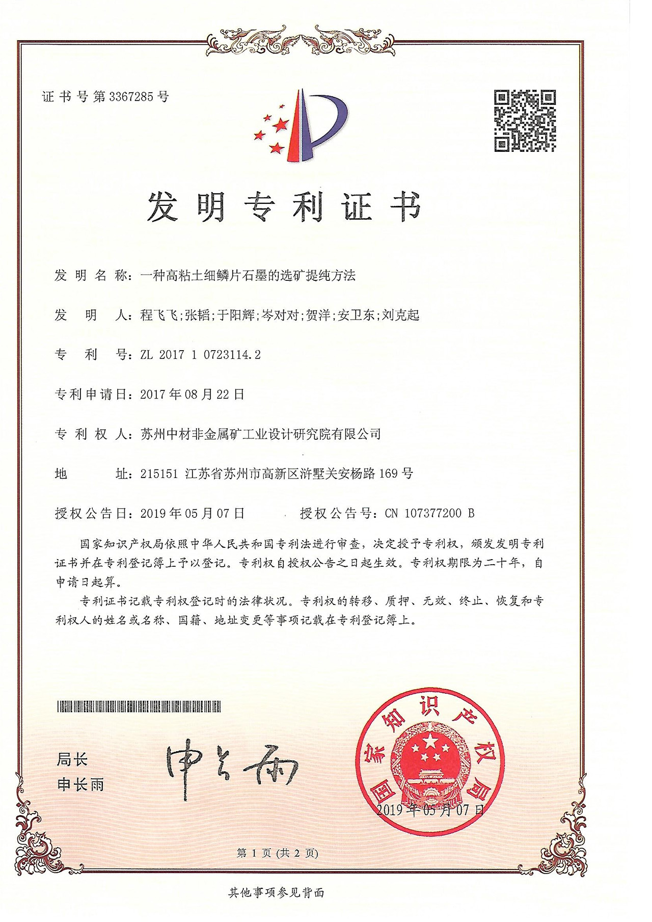 一種高粘土細鱗片石墨的選礦提純方法-專利證書