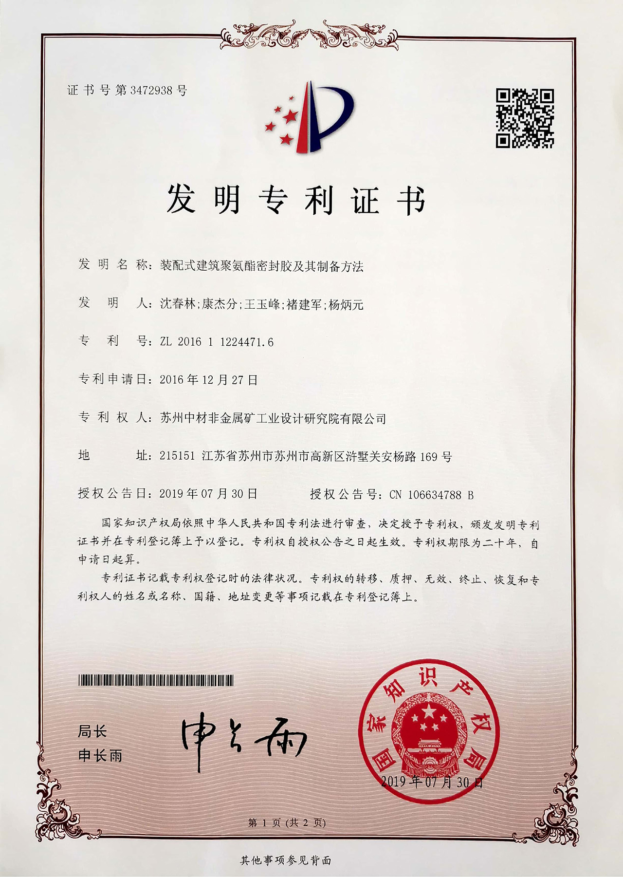 裝配式建筑聚氨酯密封膠及其制備方法-專利證書