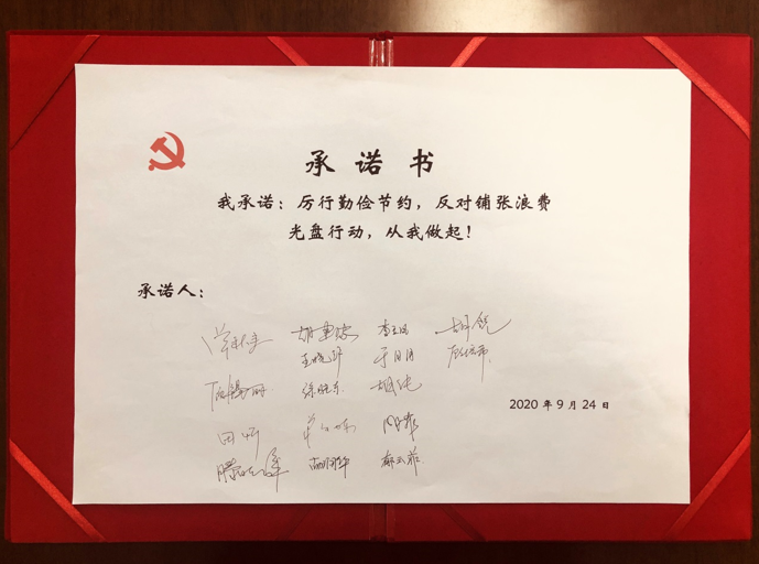 公司黨群辦制作“珍惜糧食、杜絕浪費”專欄,加大宣傳力度,號召全體黨員在活動中發(fā)揮帶頭作用。各黨支部圍繞“厲行節(jié)約,反對浪費”主題積極開展了黨日活動,第三黨支部別出心裁地用黨員手舉打印的漢字排成“厲行節(jié)約、反對浪費”的口號,表達了黨員同志們踐行節(jié)約理念的決心;第五黨支部組織黨員在“光盤行動、從我做起”的承諾書上簽字,自覺將勤儉節(jié)約、艱苦奮斗的理念內(nèi)化于心、外化于行。